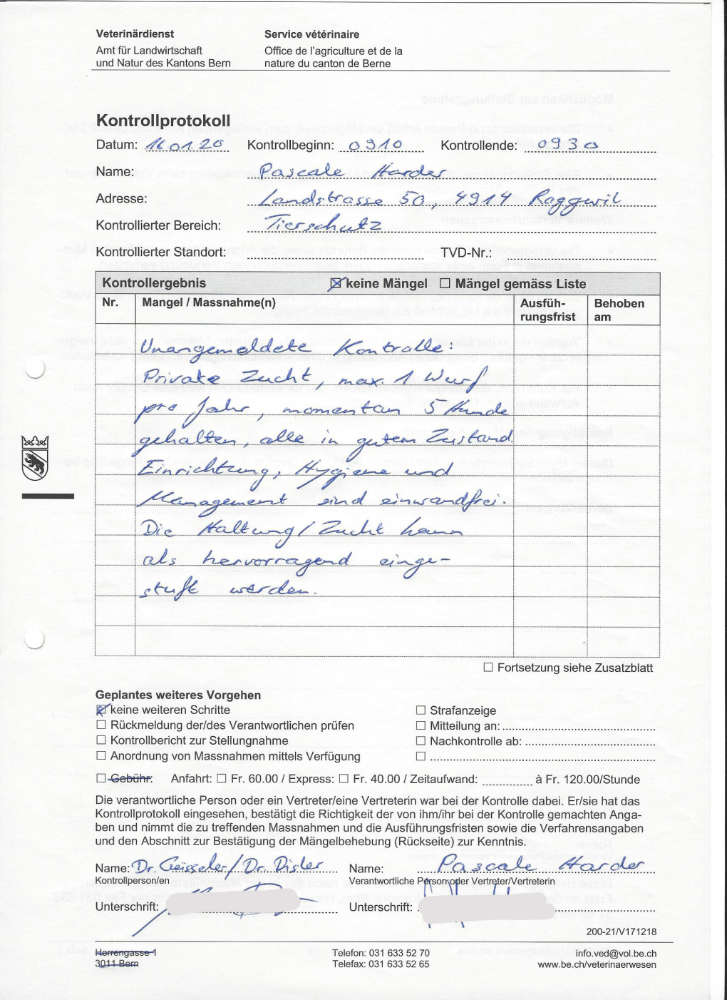 Ich bin stolz darauf, dass meine Zucht im Januar 2020 vom Veterinäramt als hervorragend bezeichnet wurde